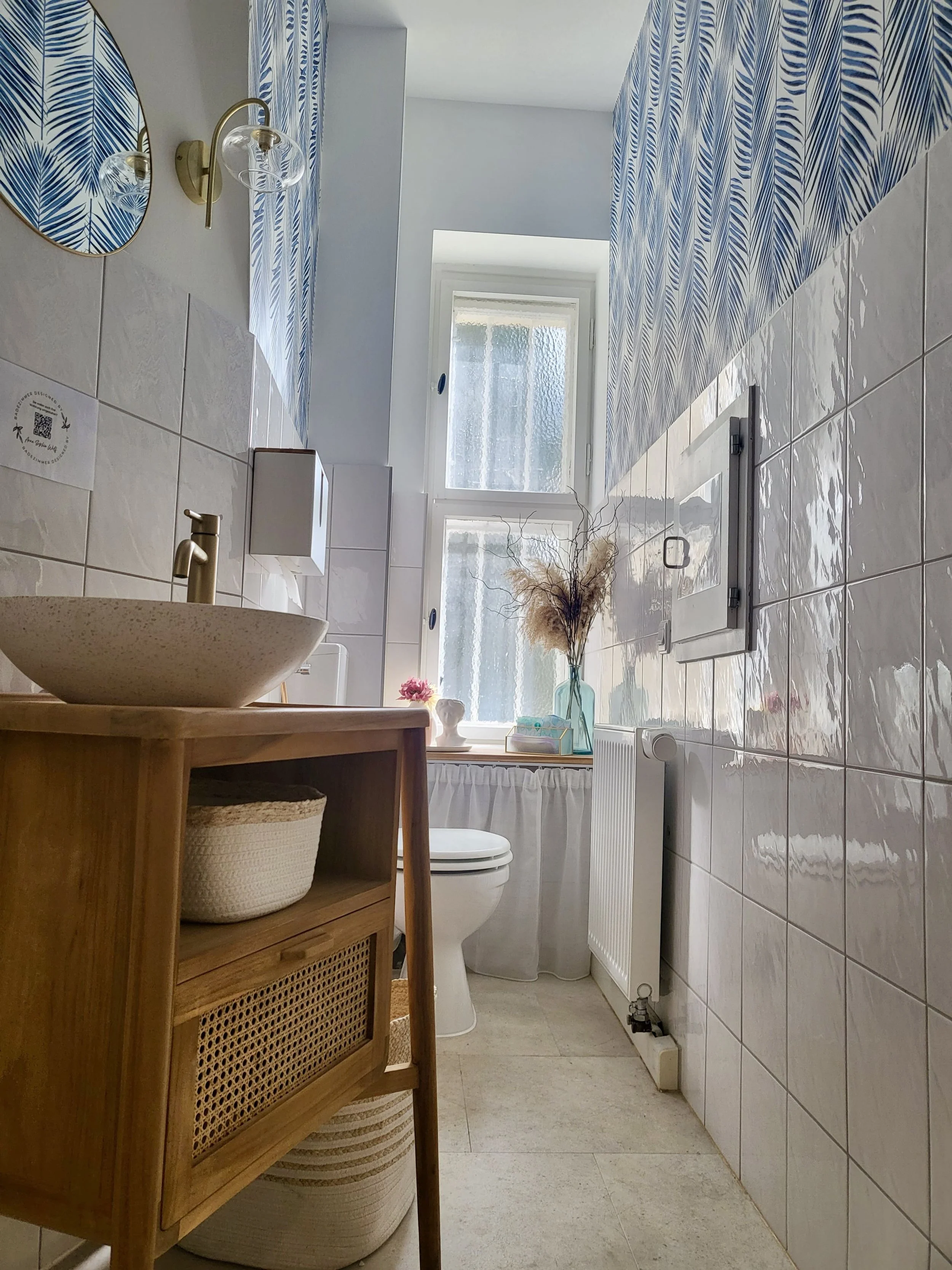 Im Zuge der Umsetzung wurden einige grundsätzliche Änderungen am Raum vorgenommen. Zu allererst wurde die neue Elektrik verlegt. Danach folgte ein neuer Boden und die alte Tapete wurde entfernt. Anschließend wurde eine neue Tapete angebracht und alle Türen gestrichen. Ein neues Waschbecken wurde ebenfalls installiert und alte Sanitäranlagen ausgewechselt. Um dem Raum den letzten Feinschliff zu geben, wurde er zum Schluss noch mit ausgewählten und teilweise selbsterstellten Dekorationen verschönert. Das Zusammenspiel aller Farben, Formen und Materialien bildet ein harmonisches Endergebnis und strahlt Gemütlichkeit aus. Eine Oase inmitten des Praxis-Trubels.