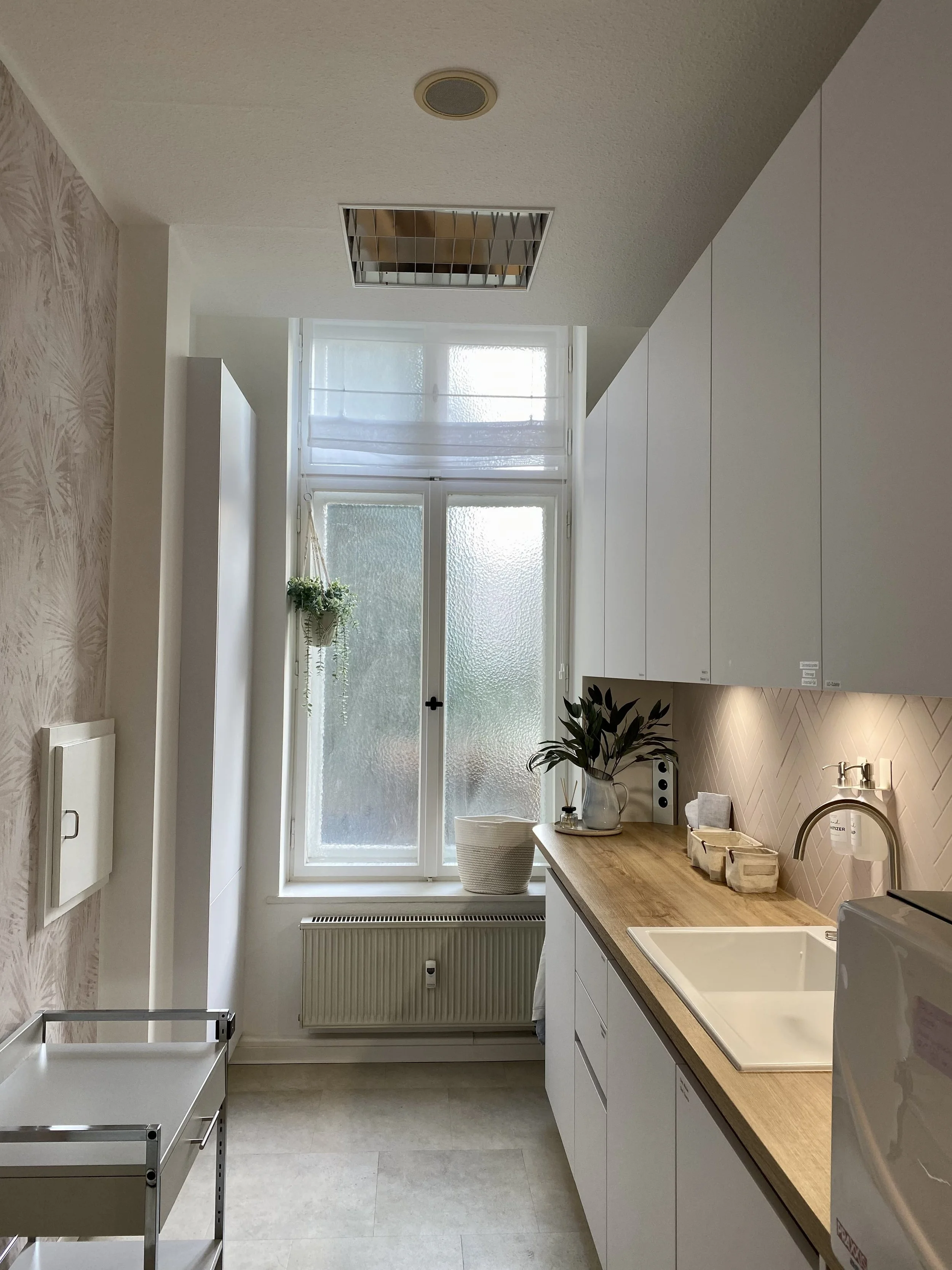 Nachdem die alten Fliesen herausgeklopft wurden, wurden die wunderschönen matt rosafarbenen Fliesen in einem Fischgrätenmuster an die Wand gebracht. Der Fußboden wurde durch den gleichen Fußboden wie im Patientinnen Bad ausgetauscht. So wird ein einheitlicher Look gewährleistet. Die Raufasertapete wurde durch Glattputz ersetzt und die neue Farntapete wurde angebracht. Während der Raum von Grund auf verändert wurde, fand im Hintergrund die Küchenplanung statt. Mehr Stauraum, Holzkorpusse in einem honigwarmen Vintage-Oak Ton und weiße Fronten bilden die Grundlage für die neue Küche. Eine schöne weiße Keramikspüle ziert die Holzarbeitsplatte und ist ein echter Blickfang. Zum Schluss wurde noch ein wenig Dekoration hinzugefügt und fertig ist der neue entspannende Arbeitsplatz.