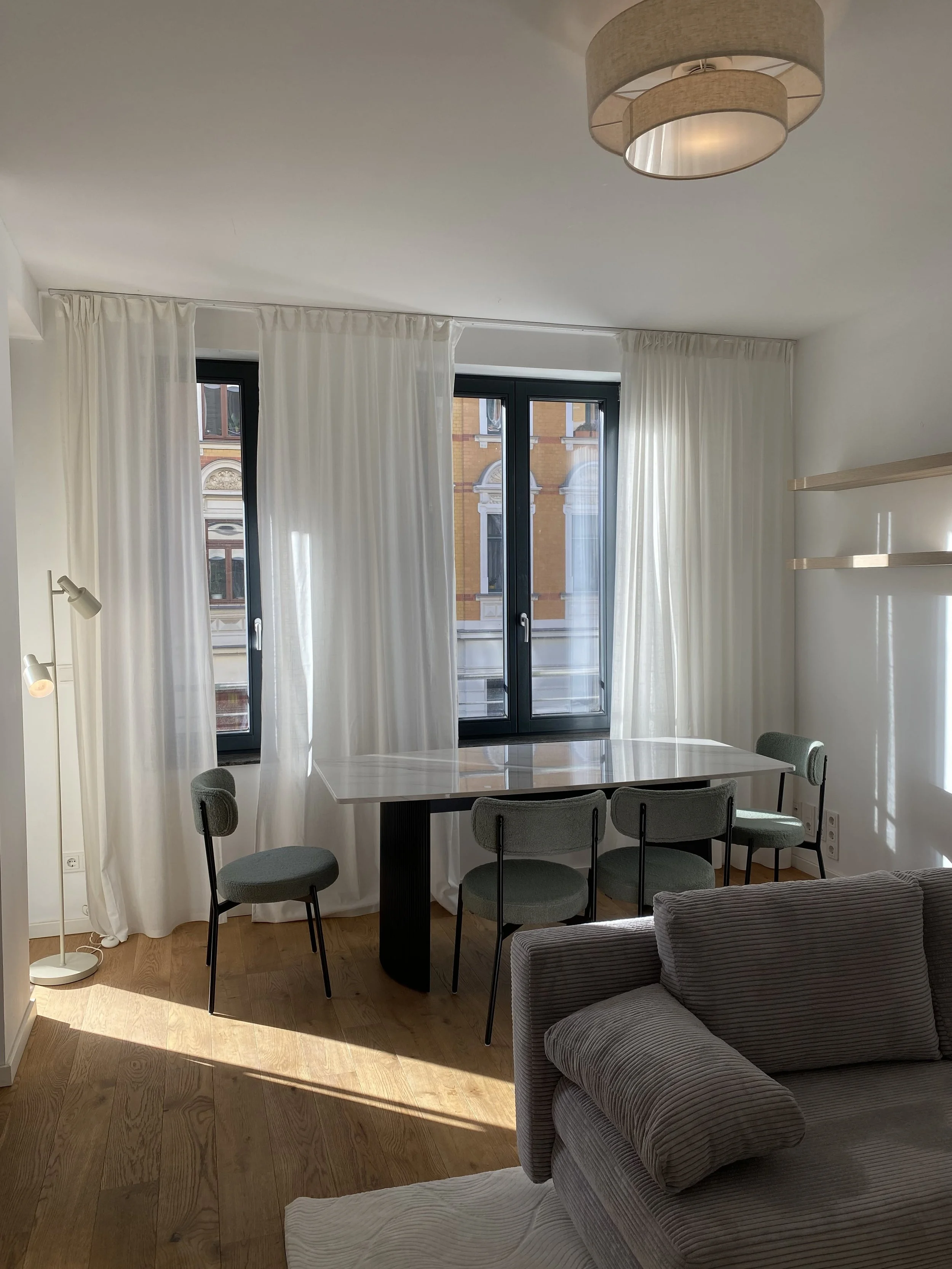 In diesem Projekt wurde eine 70qm Neubauwohnung in eine Airbnb Wohnung umgewandelt. Die 2-Raum Wohnung hat neben Wohnzimmer, Schlafzimmer, Bad, Küche und Flur auch einen Hauswirtschaftsraum und 2 Balkone. Hierfür wurde ein einheitliches Wohnungskonzept erstellt, welches sich durch jeden Raum zieht. Damit wird sichergestellt, dass die Wohnung insgesamt stimmig wirkt. Die Wohnung sollte nur mit den funktionalen Möbeln ausgestattet werden. Somit wurde keine Dekoration der Räume vorgenommen.