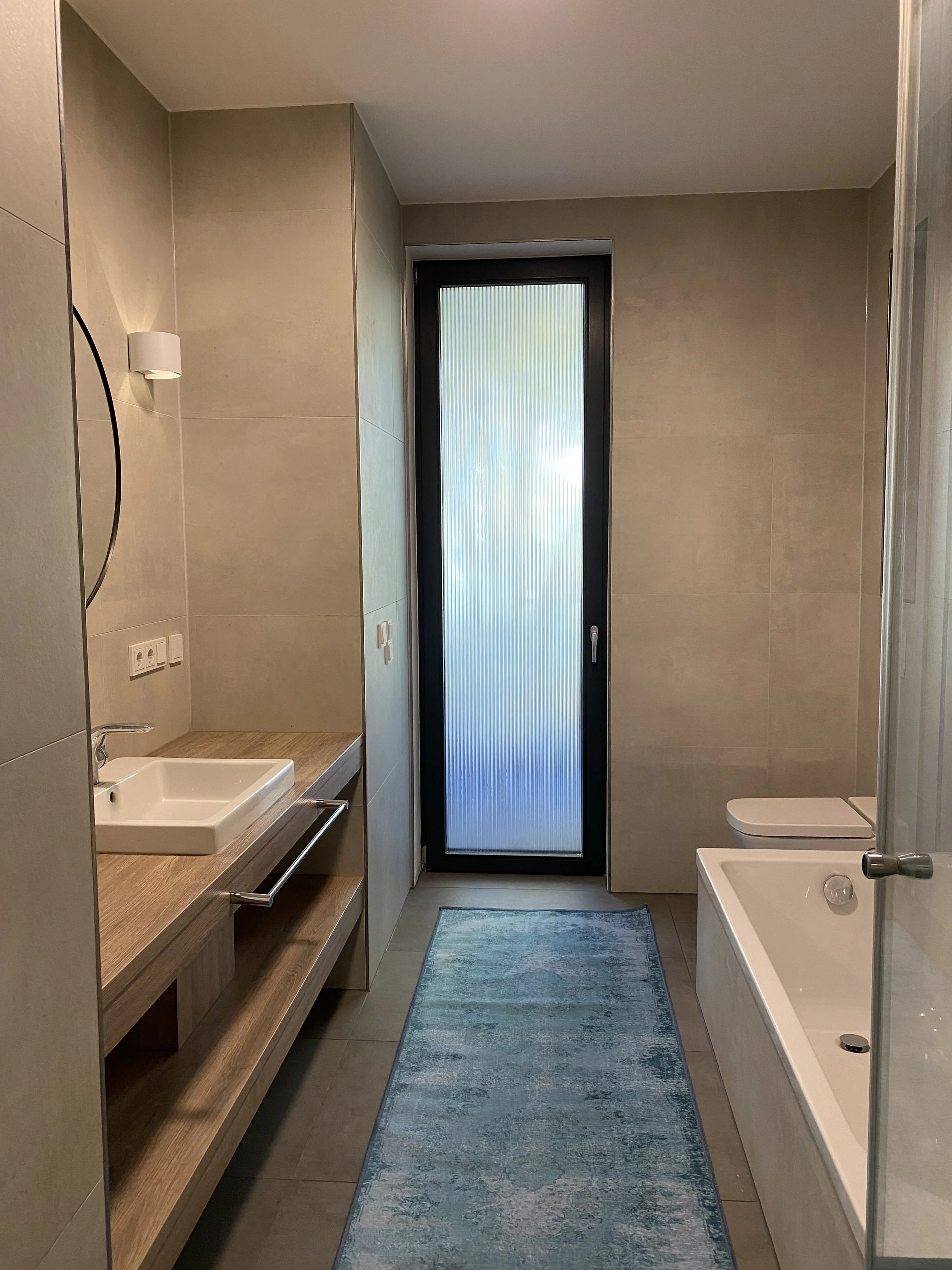 Im Badezimmer wurden nur ein paar essentielle Veränderungen vorgenommen. Neben den Lampen wurden noch ein Spiegel und ein Teppich für warme Füße hinzugefügt. Sowie ein Sichtschutz auf der Fensterschreibe angebracht.