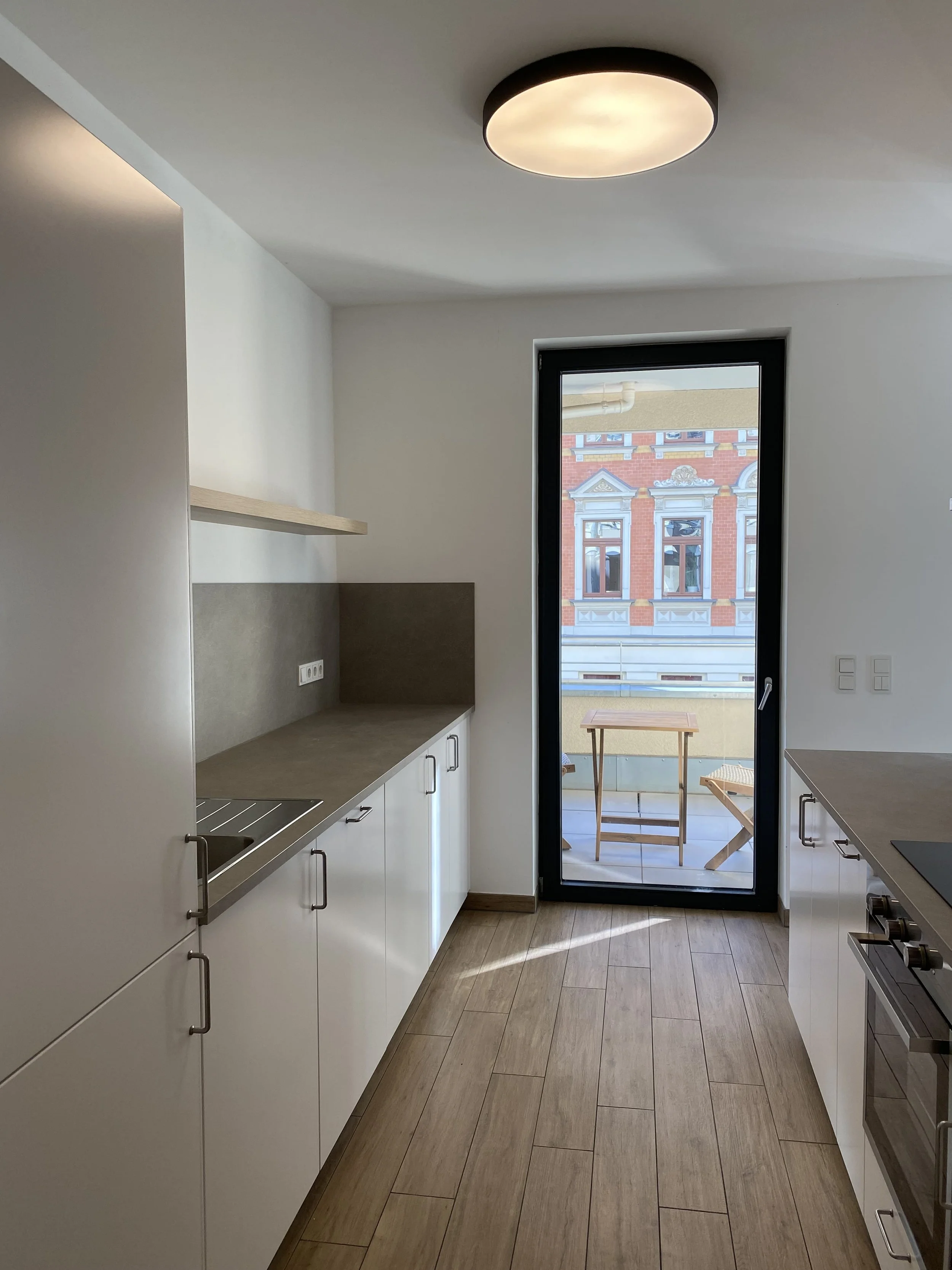 Da ursprünglich noch keine Küche vorhanden war, musste zunächst eine neue Küche geplant und eingebaut werden. Hier wurde sich für klassische weiße Fronten und eine warme, braun-gemusterte Arbeitsfläche entschieden.